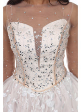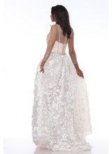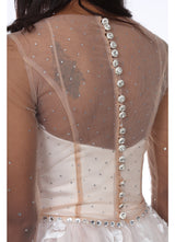 Detachable mesh top with crystal buttons and built in bra. Hand beaded with high quality crystals and 80% of swarovski crystals on the top and sleeves .